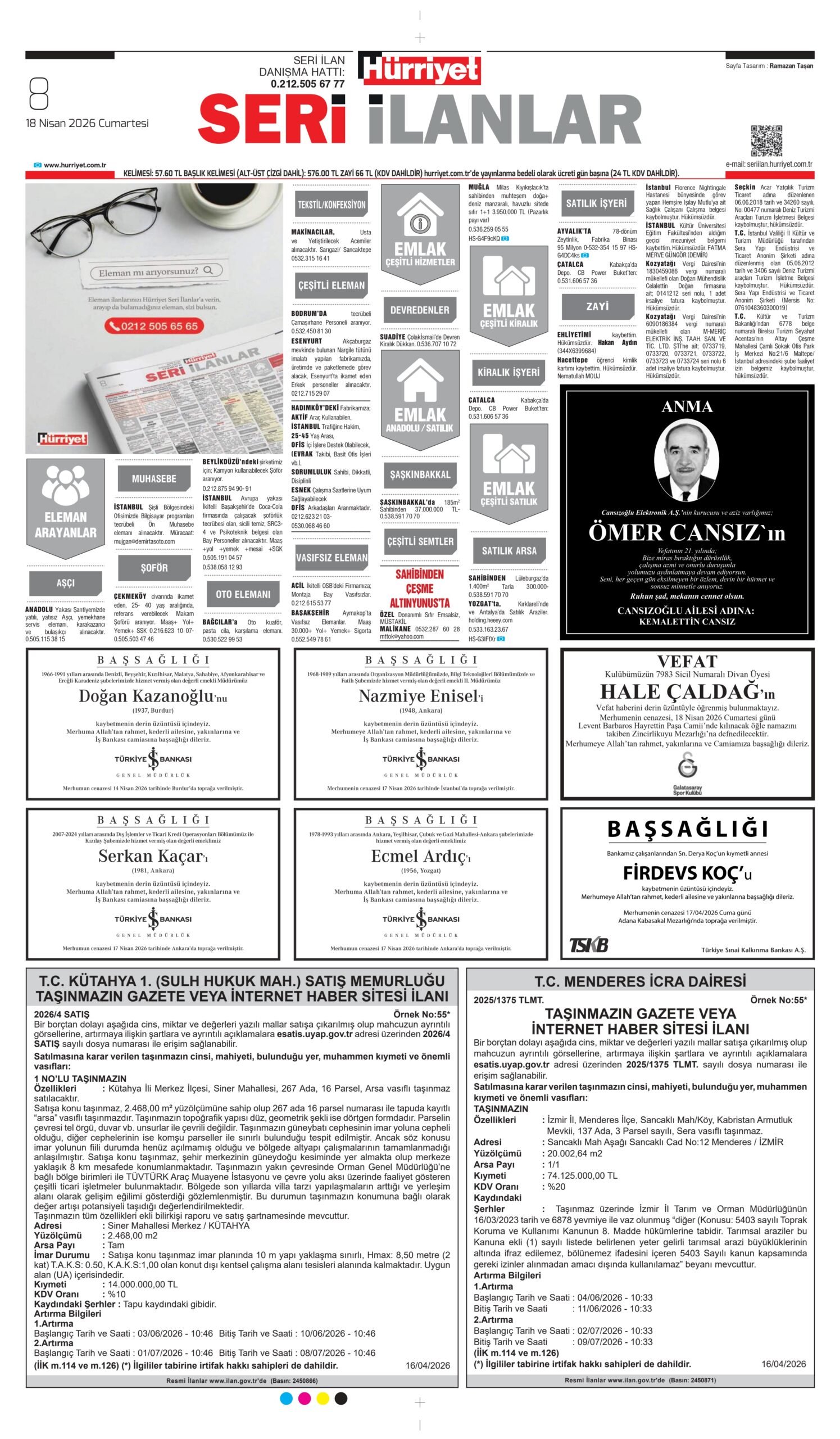 18 Nisan 2026 Hürriyet Gazetesi vefat, başsağlığı ve anma ilanları.
