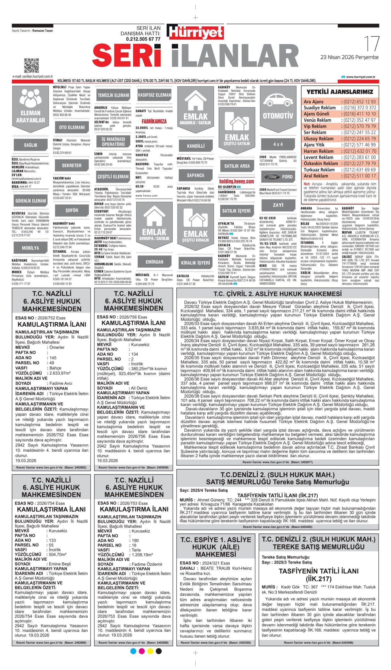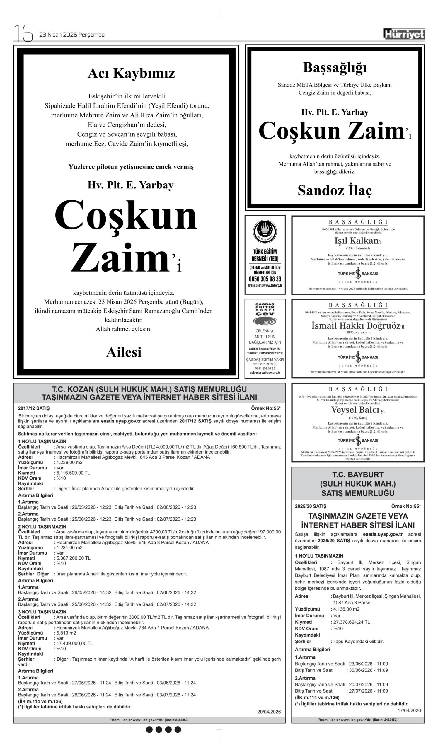 23 Nisan 2026 Hürriyet Gazetesi vefat, başsağlığı ve anma ilanları.