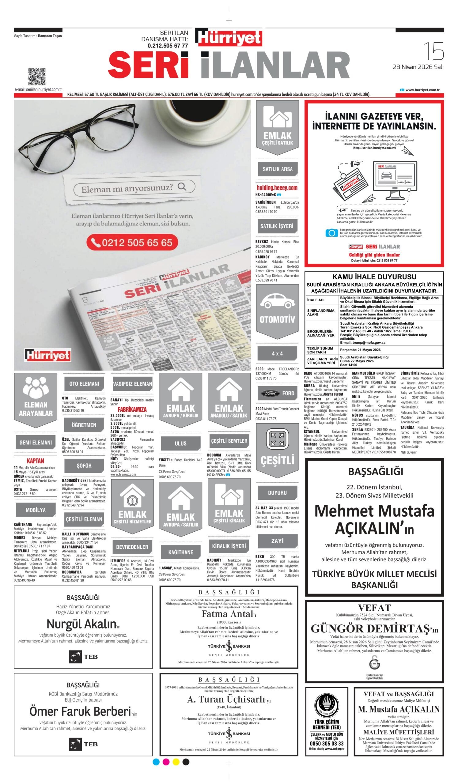 28 Nisan 2026 tarihli Hürriyet Gazetesi vefat, başsağlığı ve anma ilanları.