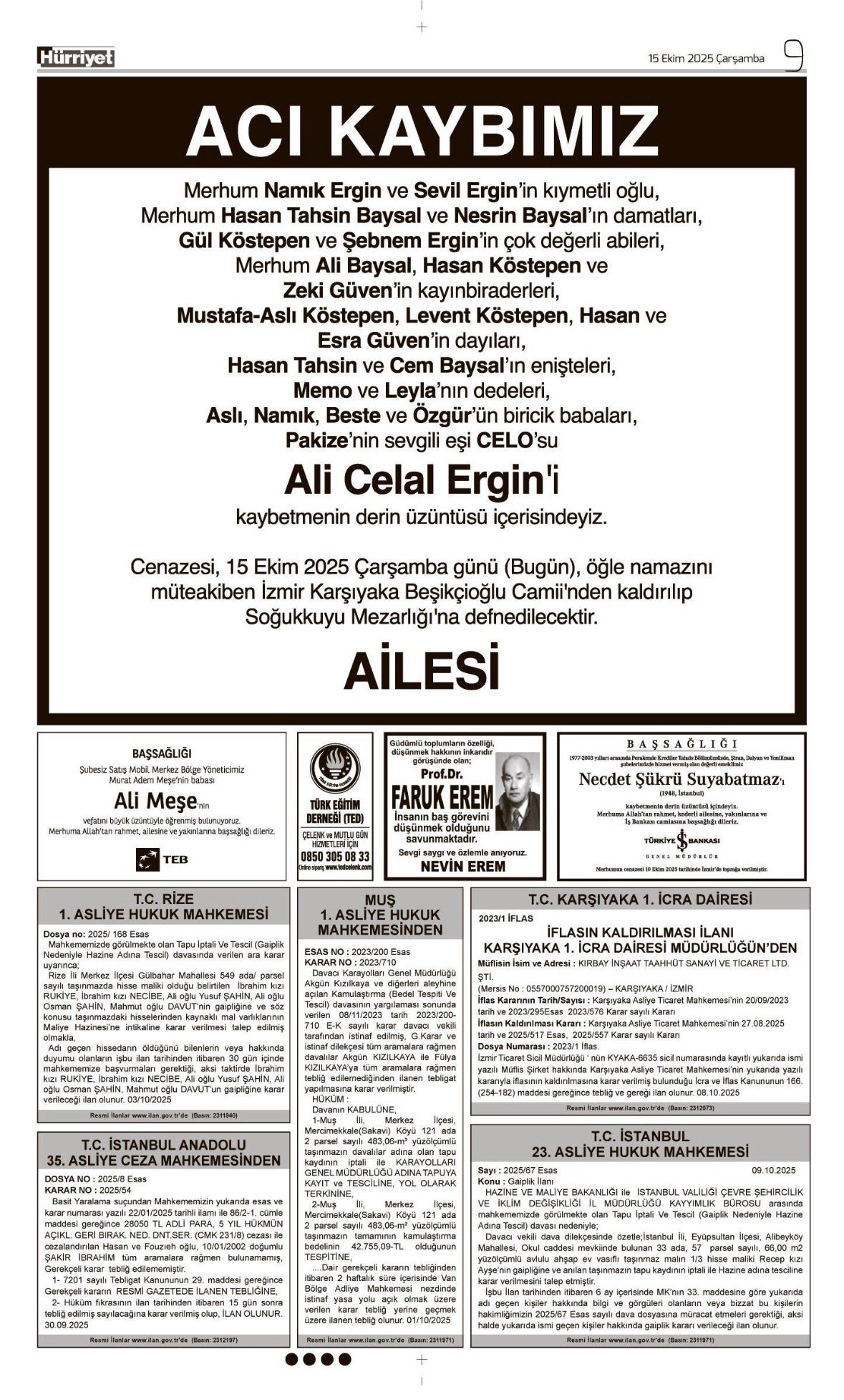 Hürriyet Bugünkü Vefat (Ölüm) – Başsağlığı – Anma – Teşekkür – Mevlit İlanları-15.10.2025