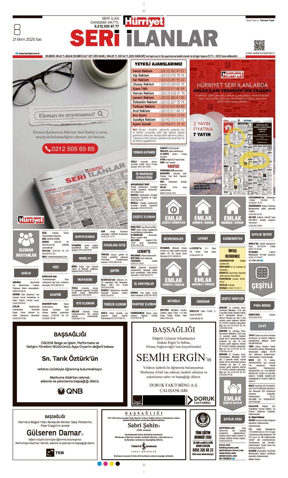 Hürriyet Bugünkü Vefat (Ölüm) – Başsağlığı – Anma – Teşekkür – Mevlit İlanları-21.10.2025