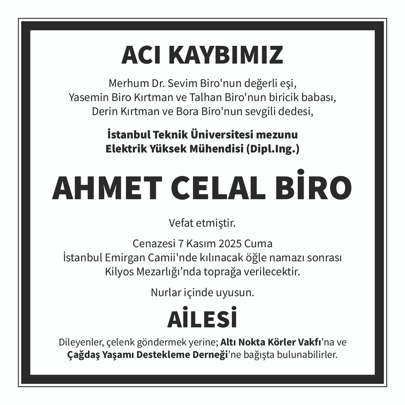Hürriyet vefat ilanları, Ahmet Celal Biro, cenazesi 7 Kasım 2025 Cuma öğle namazına müteakip Kilyos Mezarlığı'nda toprağa verilecektir. Nurlar …