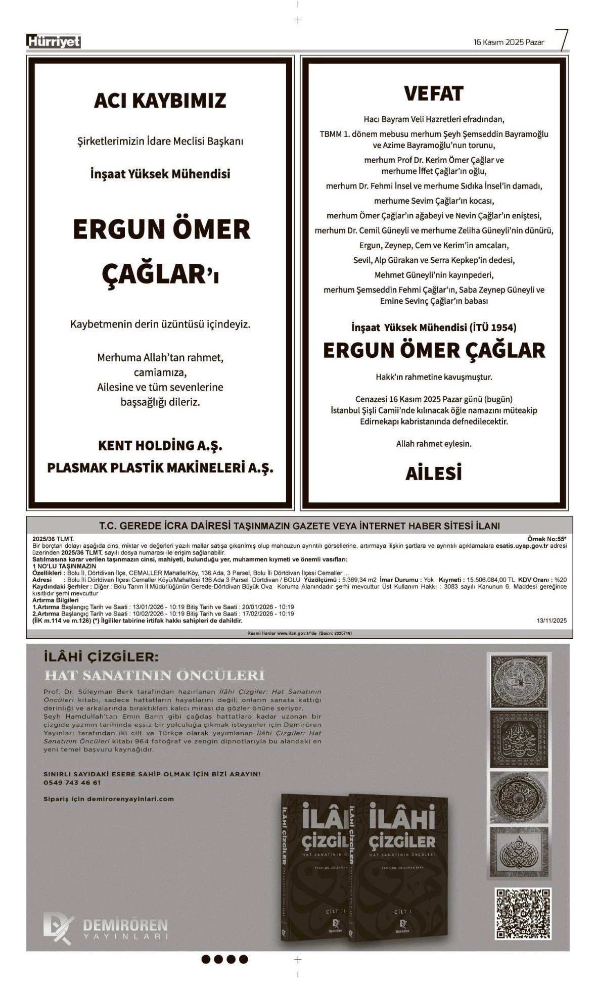 Hürriyet Bugünkü Vefat (Ölüm) – Başsağlığı – Anma – Teşekkür – Mevlit İlanları-16.11.2025ERGUN ÖMER ÇAĞLAR - VEFAT İLANI,İSTANBUL’DA VEFAT…
