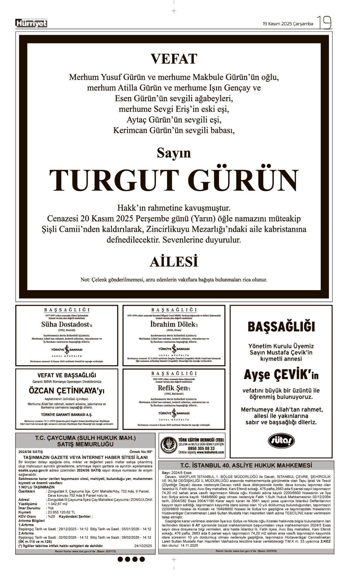 Hürriyet Bugünkü Vefat (Ölüm) – Başsağlığı – Anma – Teşekkür – Mevlit İlanları-19.11.2025TURGUT GÜRÜN - VEFAT İLANI, SÜHA DOSTADOST - …