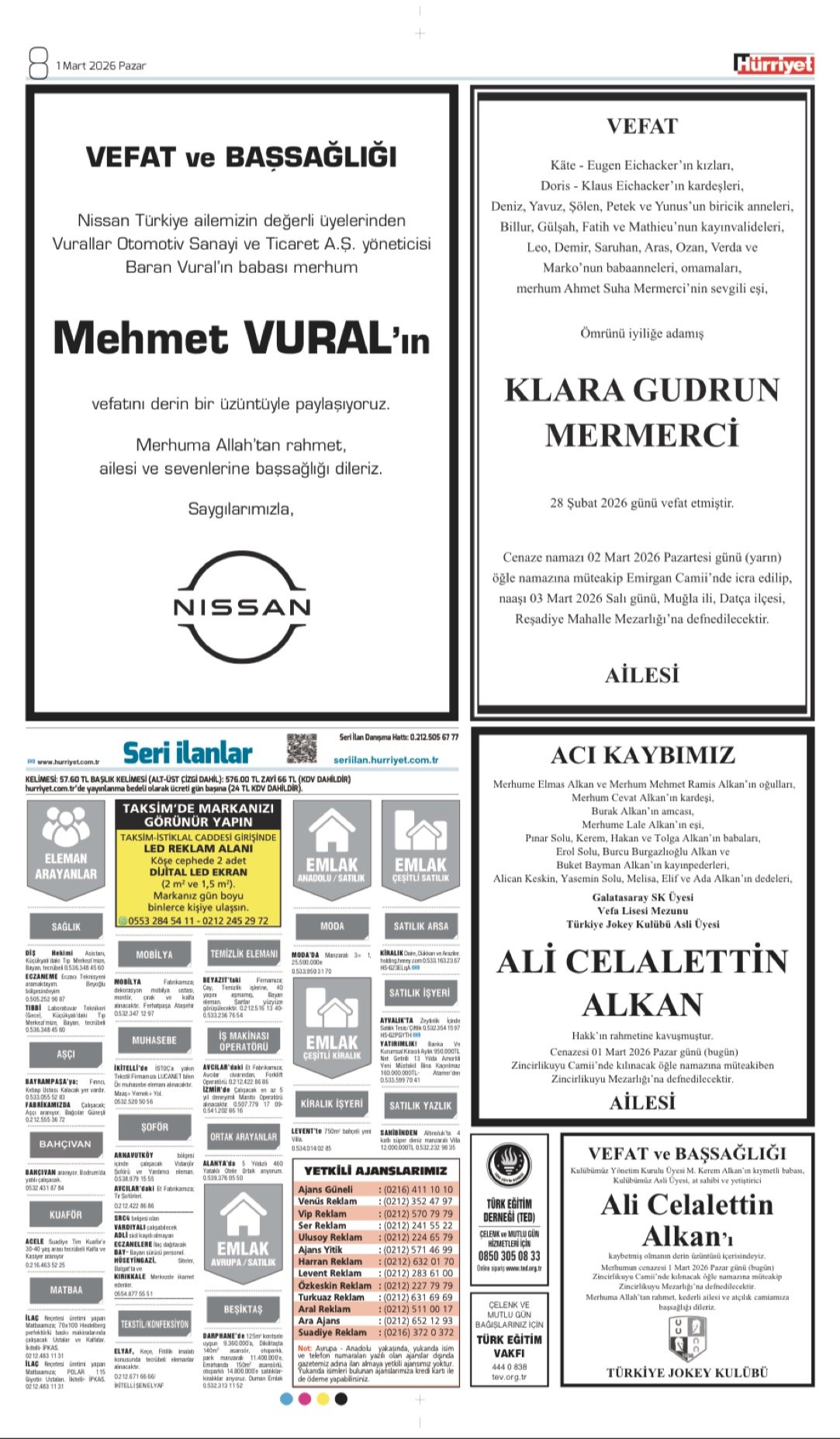 Hürriyet Bugünkü Vefat (Ölüm) – Başsağlığı – Anma – Teşekkür – Mevlit İlanları-1.3.2026