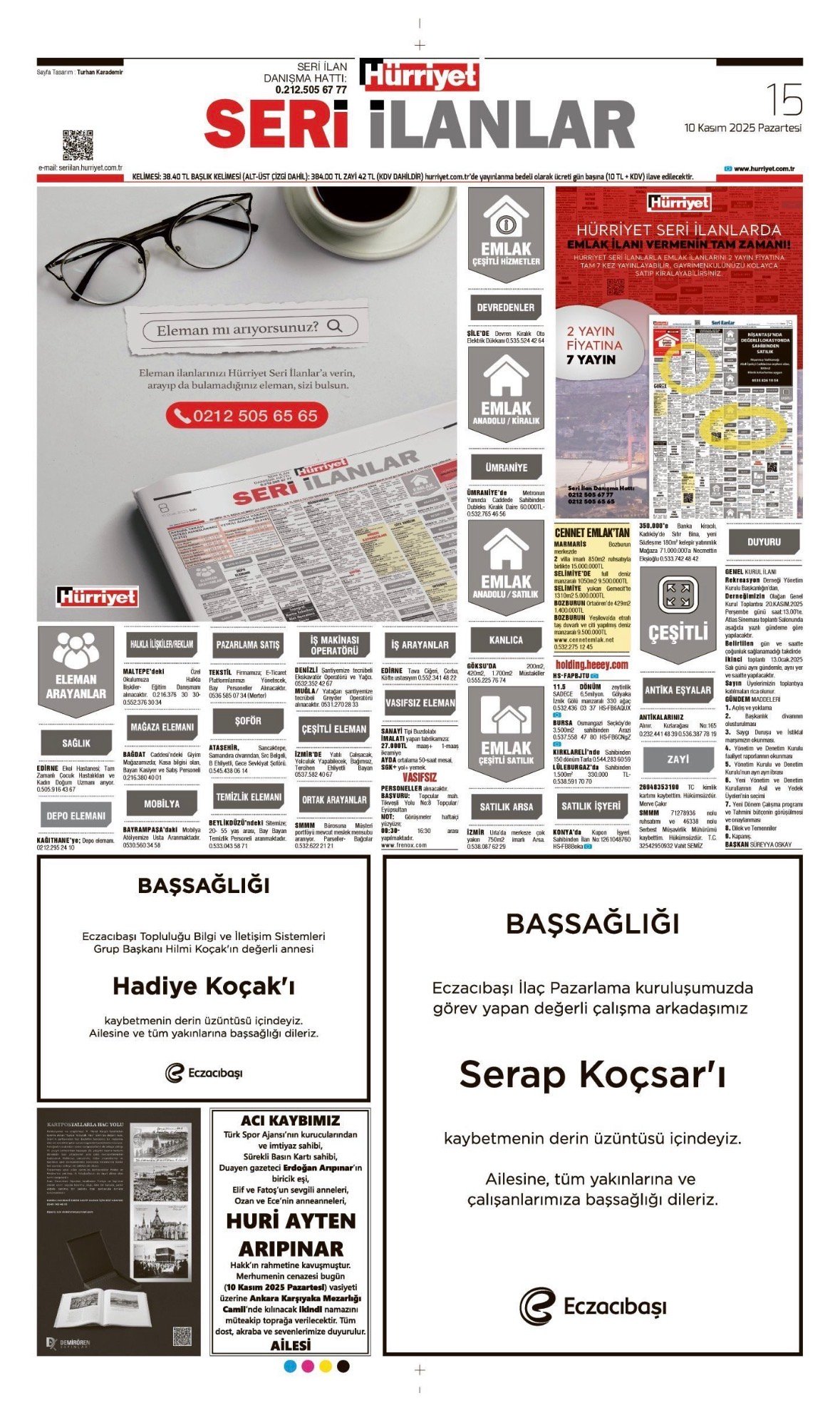Hürriyet Bugünkü Vefat (Ölüm) – Başsağlığı – Anma – Teşekkür – Mevlit İlanları-10.11.2025