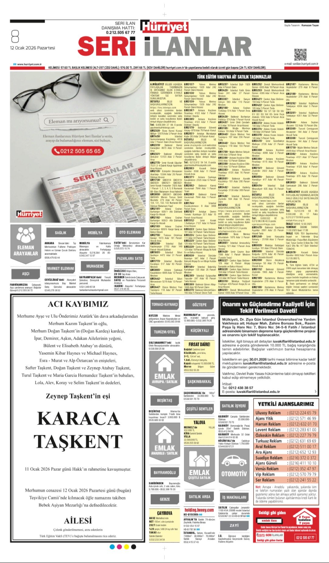 Hürriyet Bugünkü Vefat (Ölüm) – Başsağlığı – Anma – Teşekkür – Mevlit İlanları-12.1.2026