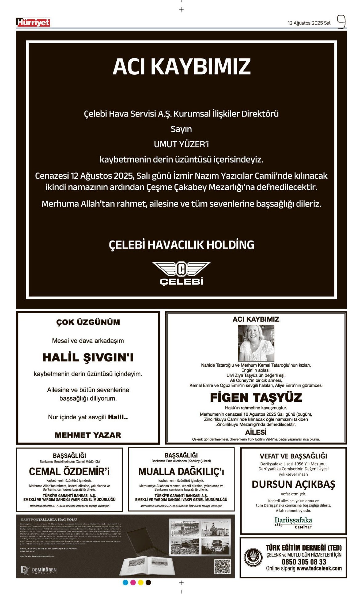 Hürriyet Bugünkü Vefat (Ölüm) – Başsağlığı – Anma – Teşekkür – Mevlit İlanları-12.8.2025