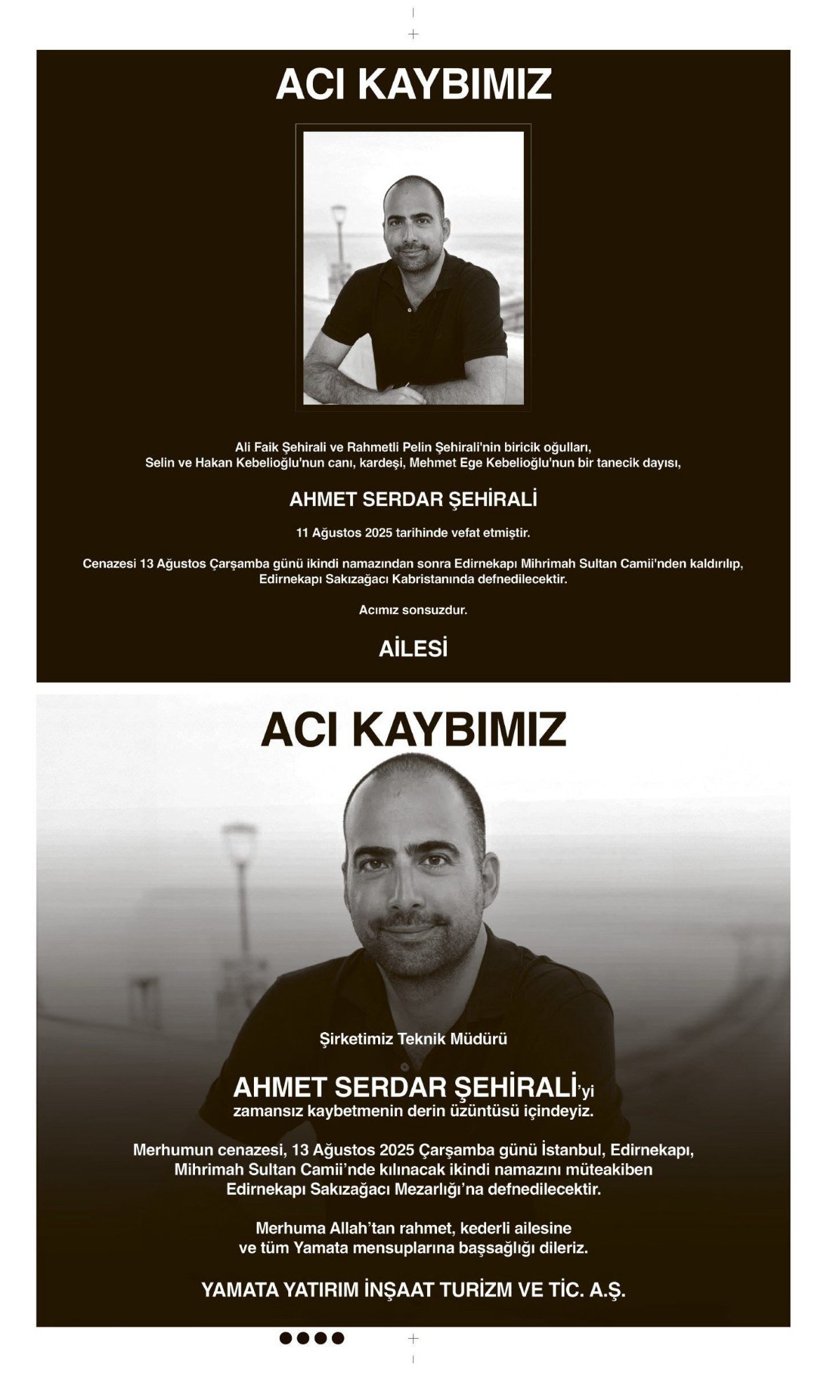 • AHMET SERDAR ŞEHİRALİ – VEFAT ve BAŞSAĞLIĞI İLANI,