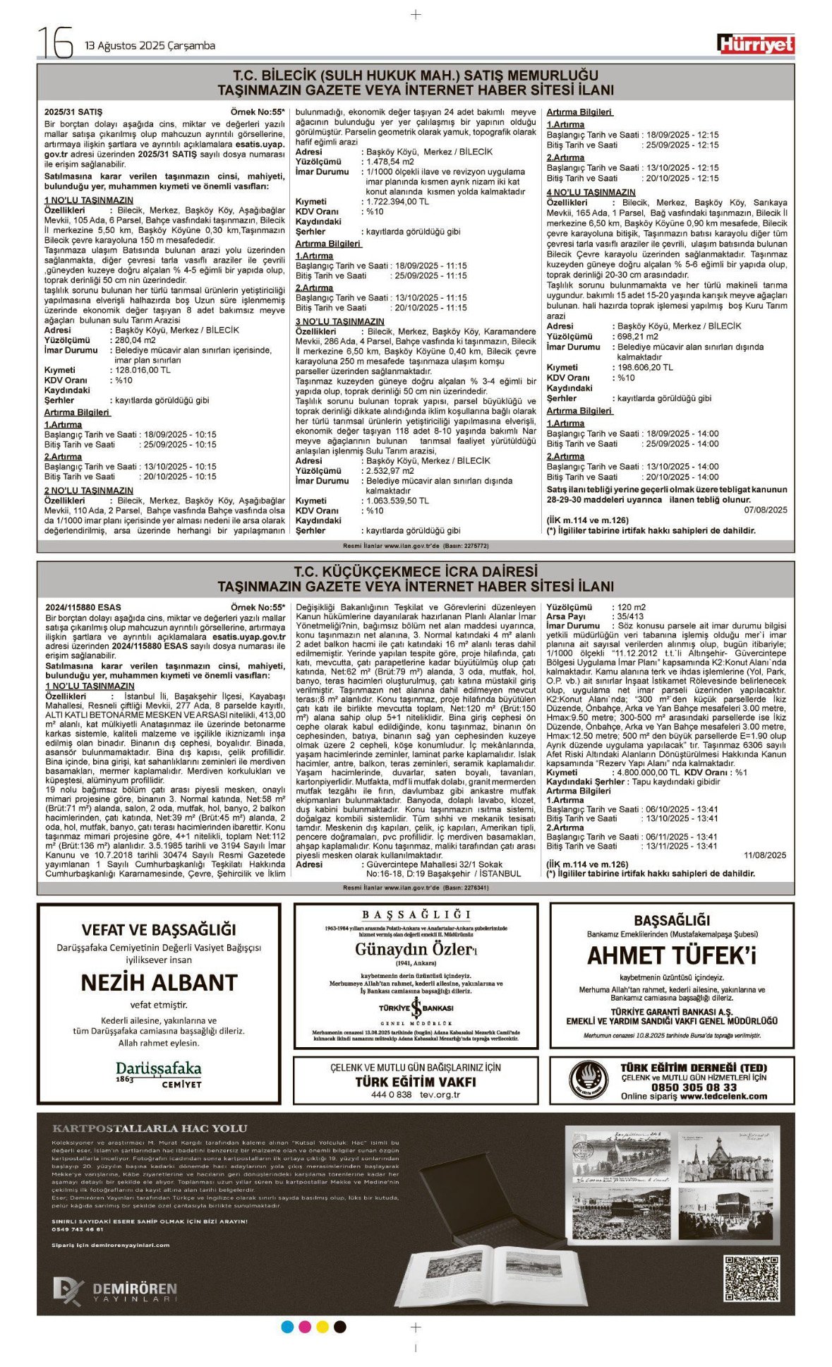 Hürriyet Bugünkü Vefat (Ölüm) – Başsağlığı – Anma – Teşekkür – Mevlit İlanları-13.8.2025