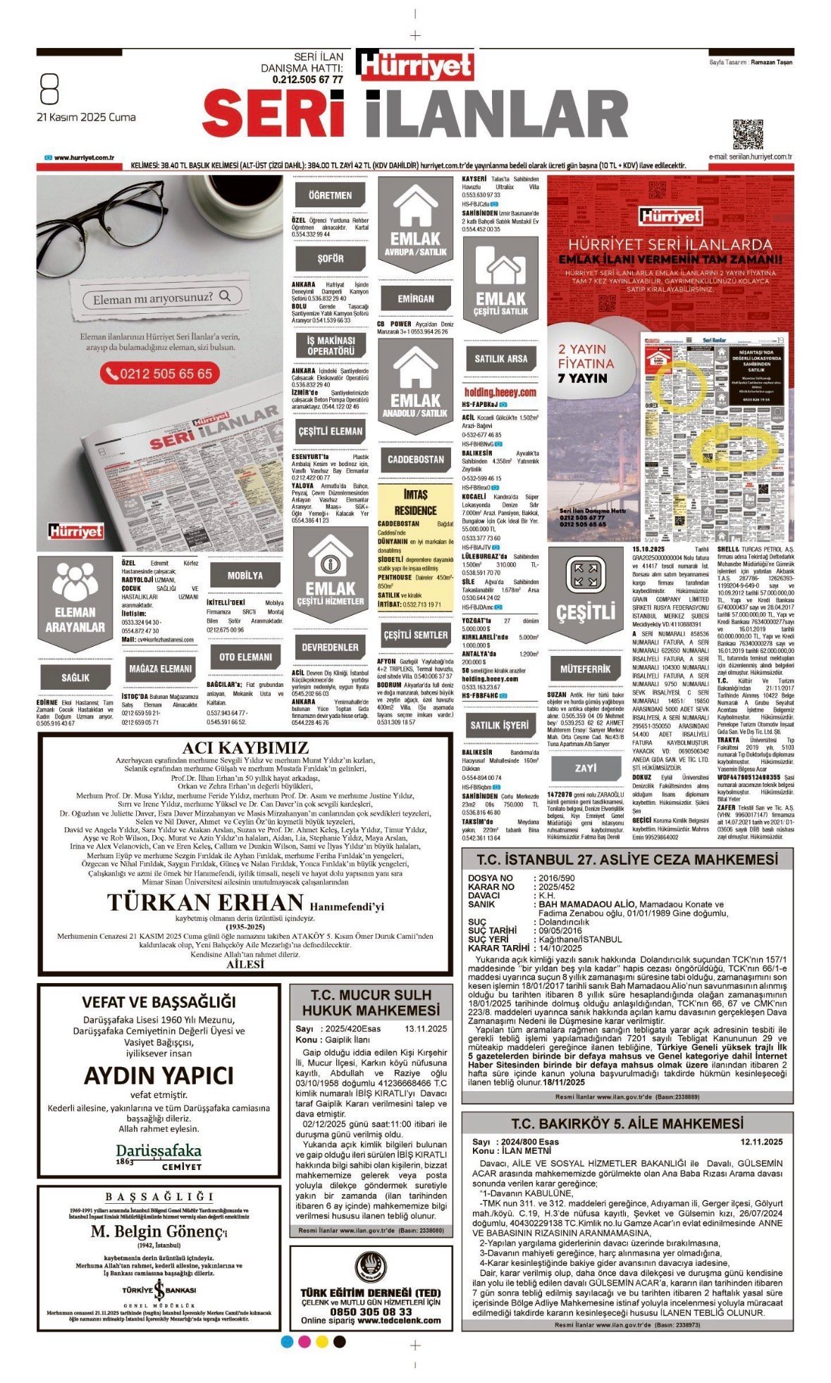 Hürriyet Bugünkü Vefat (Ölüm) – Başsağlığı – Anma – Teşekkür – Mevlit İlanları-21.11.2025