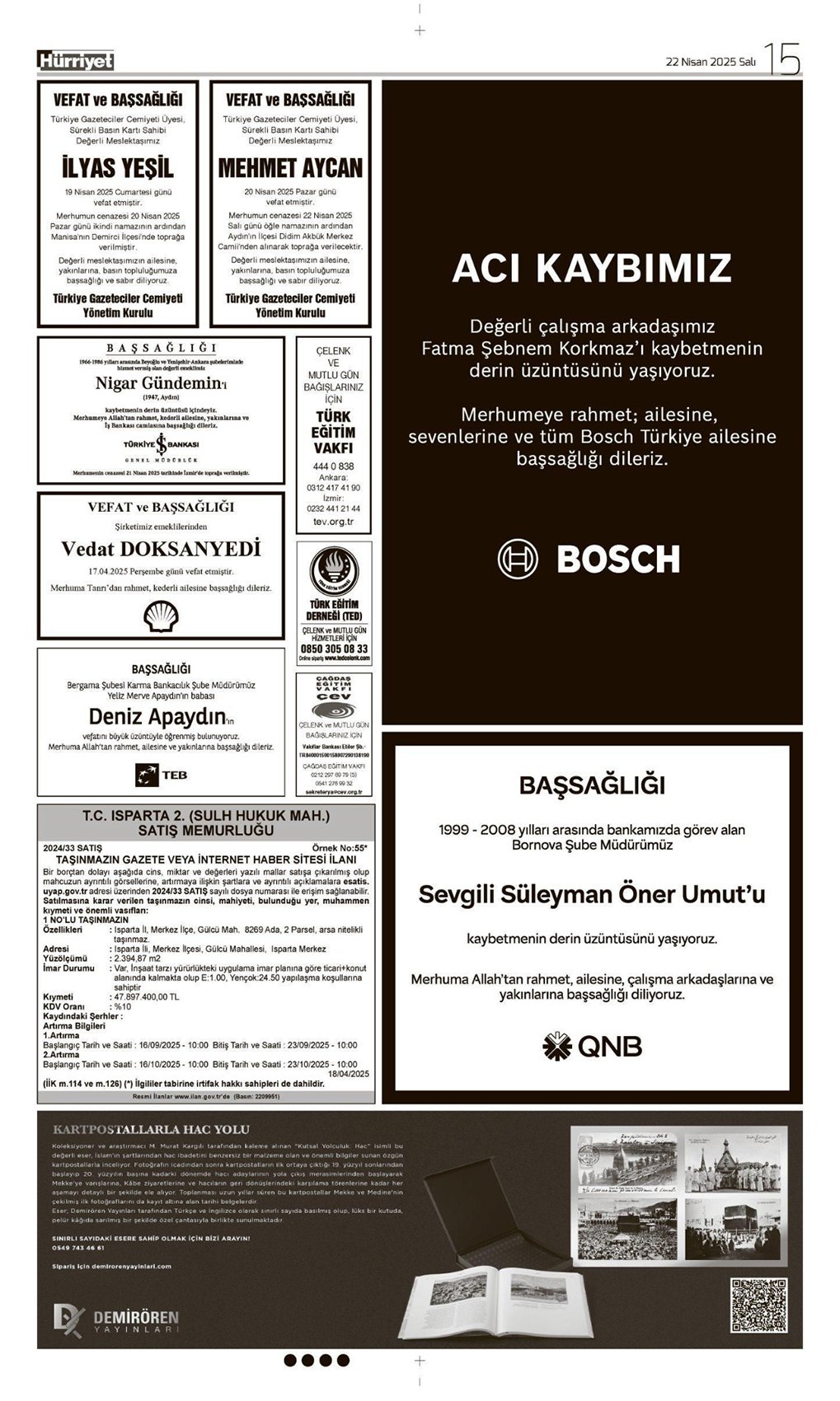 Hürriyet Bugünkü Vefat (Ölüm) – Başsağlığı – Anma – Teşekkür – Mevlit İlanları-22.04.2025