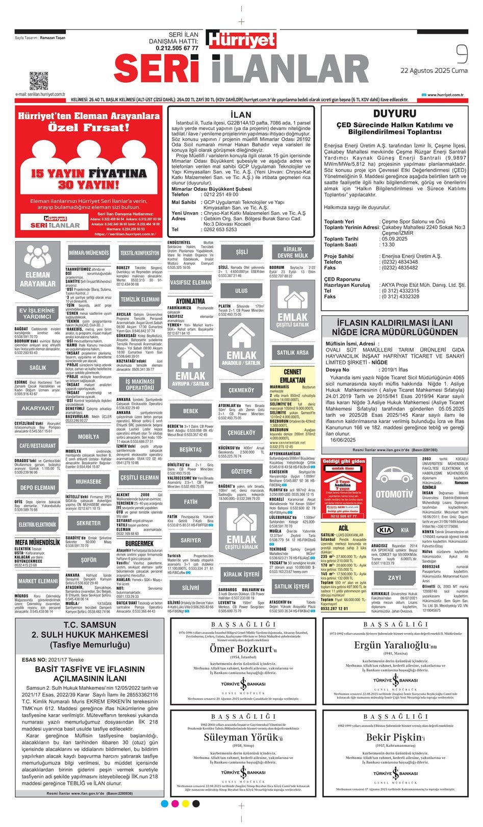 Hürriyet Bugünkü Vefat (Ölüm) – Başsağlığı – Anma – Teşekkür – Mevlit İlanları-22.8.2025