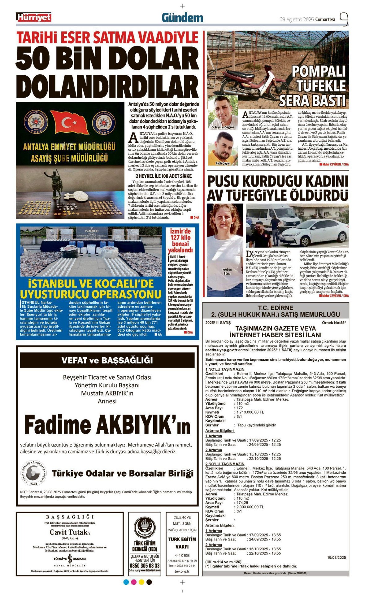 Hürriyet Bugünkü Vefat (Ölüm) – Başsağlığı – Anma – Teşekkür – Mevlit İlanları-23.8.2025
