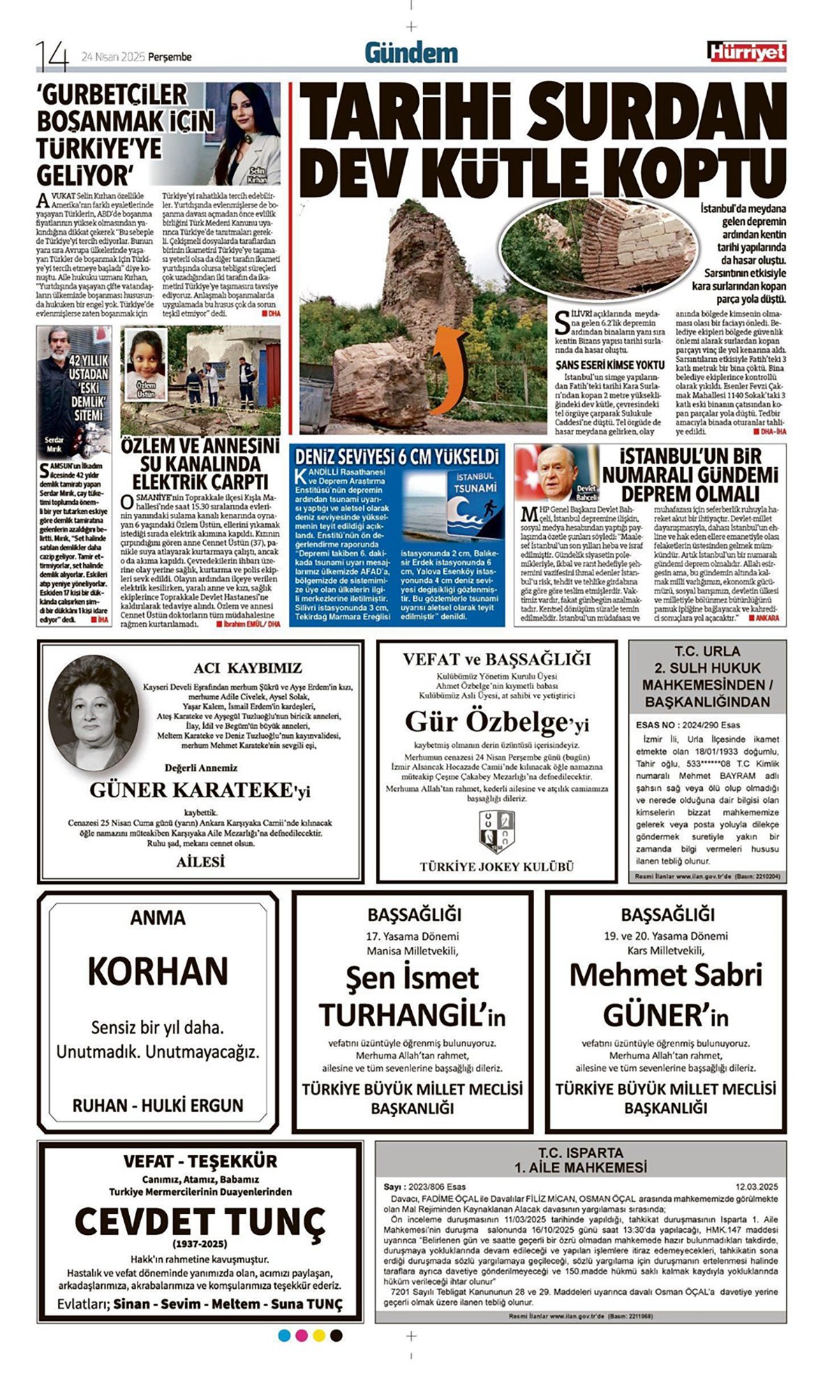 Hürriyet Bugünkü Vefat (Ölüm) – Başsağlığı – Anma – Teşekkür – Mevlit İlanları-24 Nisan 2025