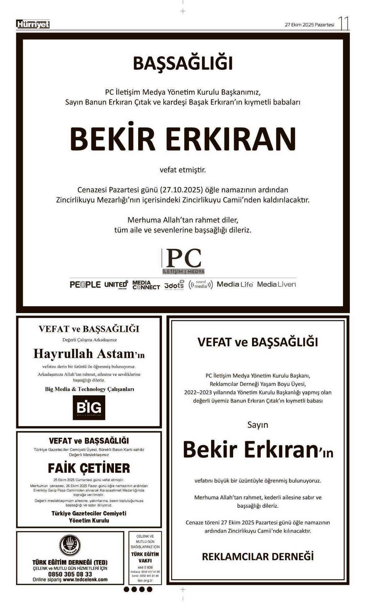 Hürriyet Bugünkü Vefat (Ölüm) – Başsağlığı – Anma – Teşekkür – Mevlit İlanları-27.10.2025
