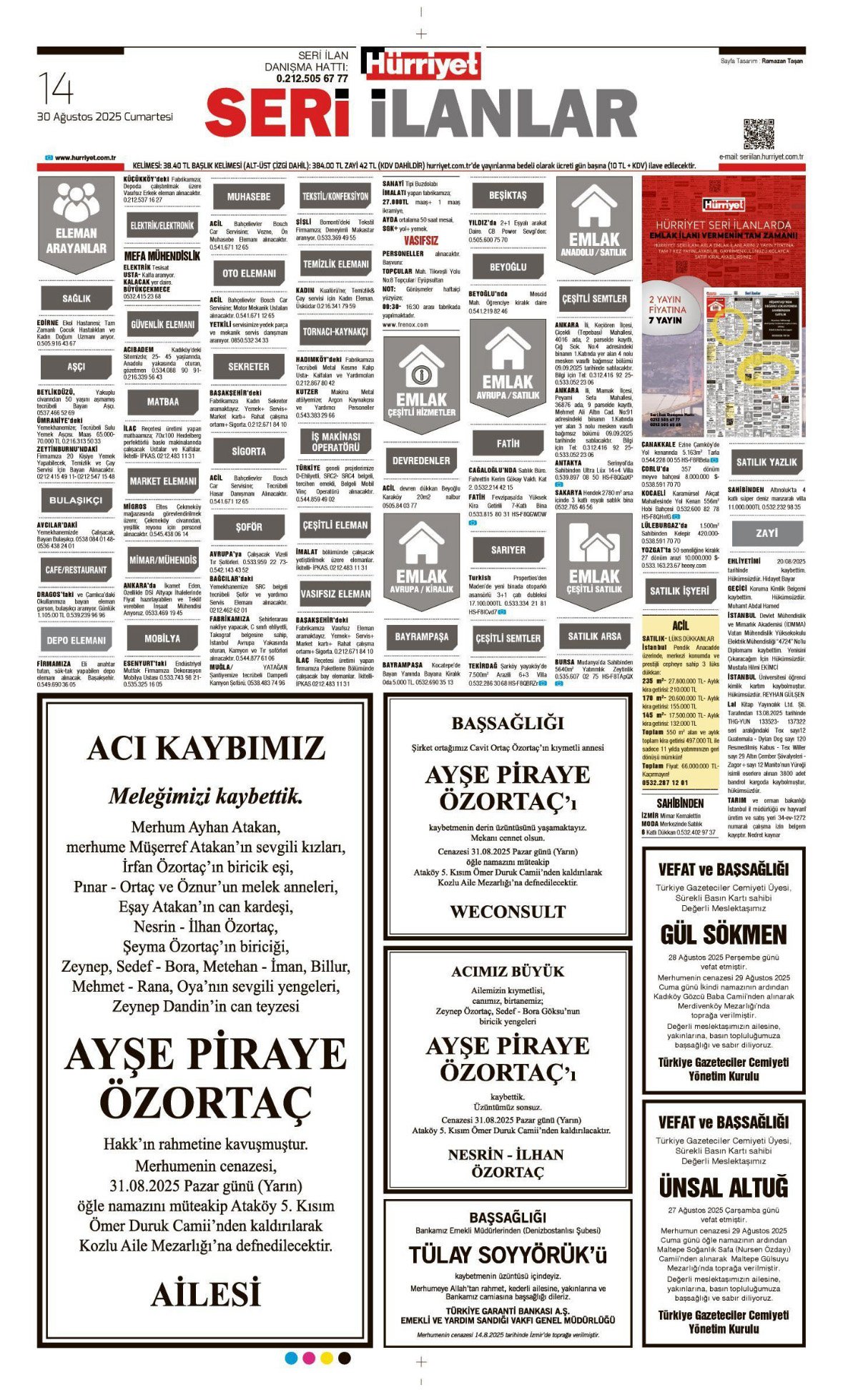 Hürriyet Bugünkü Vefat (Ölüm) – Başsağlığı – Anma – Teşekkür – Mevlit İlanları-30.8.2025