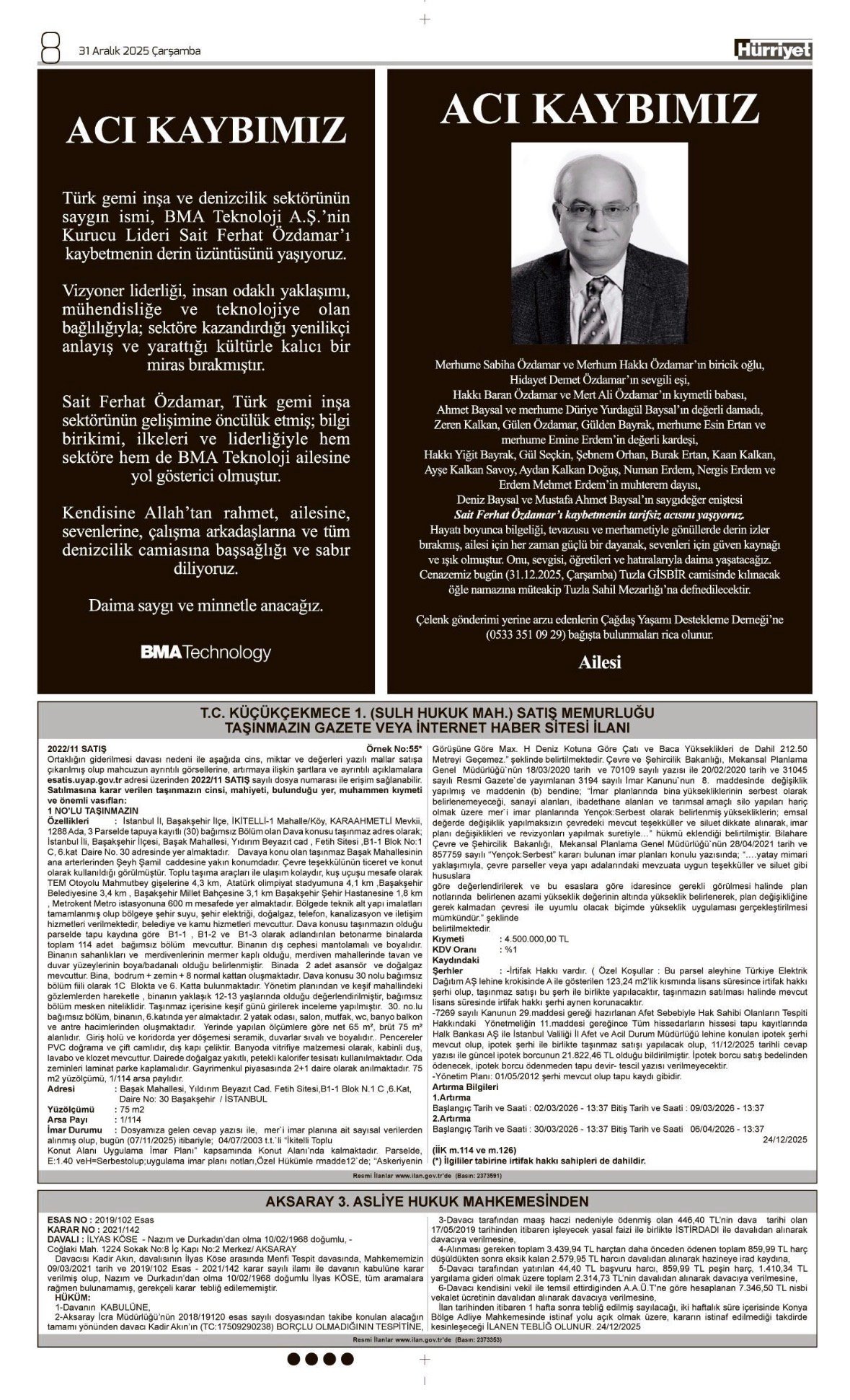 Hürriyet Bugünkü Vefat (Ölüm) – Başsağlığı – Anma – Teşekkür – Mevlit İlanları-31.12.2025