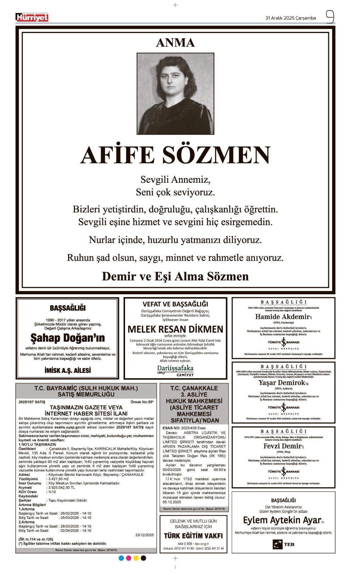 • AFİFE SÖZMEN – VEFAT ANMA İLANI,
