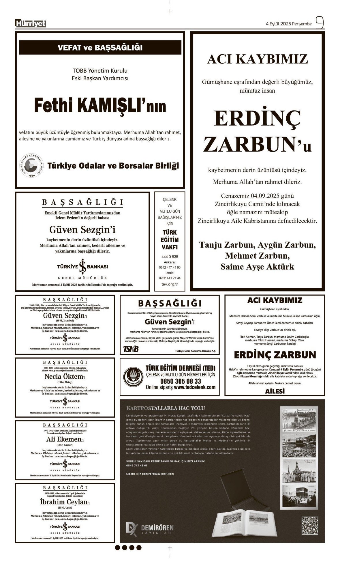 Hürriyet Bugünkü Vefat (Ölüm) – Başsağlığı – Anma – Teşekkür – Mevlit İlanları-4.9.2025