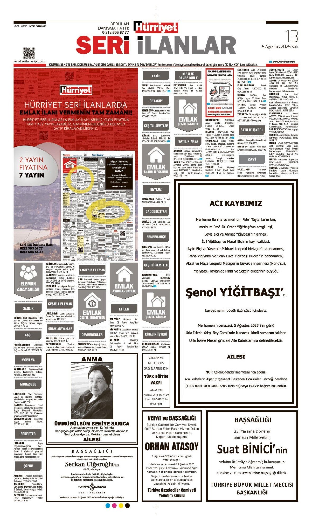 Hürriyet Bugünkü Vefat (Ölüm) – Başsağlığı – Anma – Teşekkür – Mevlit İlanları-5.8.2025