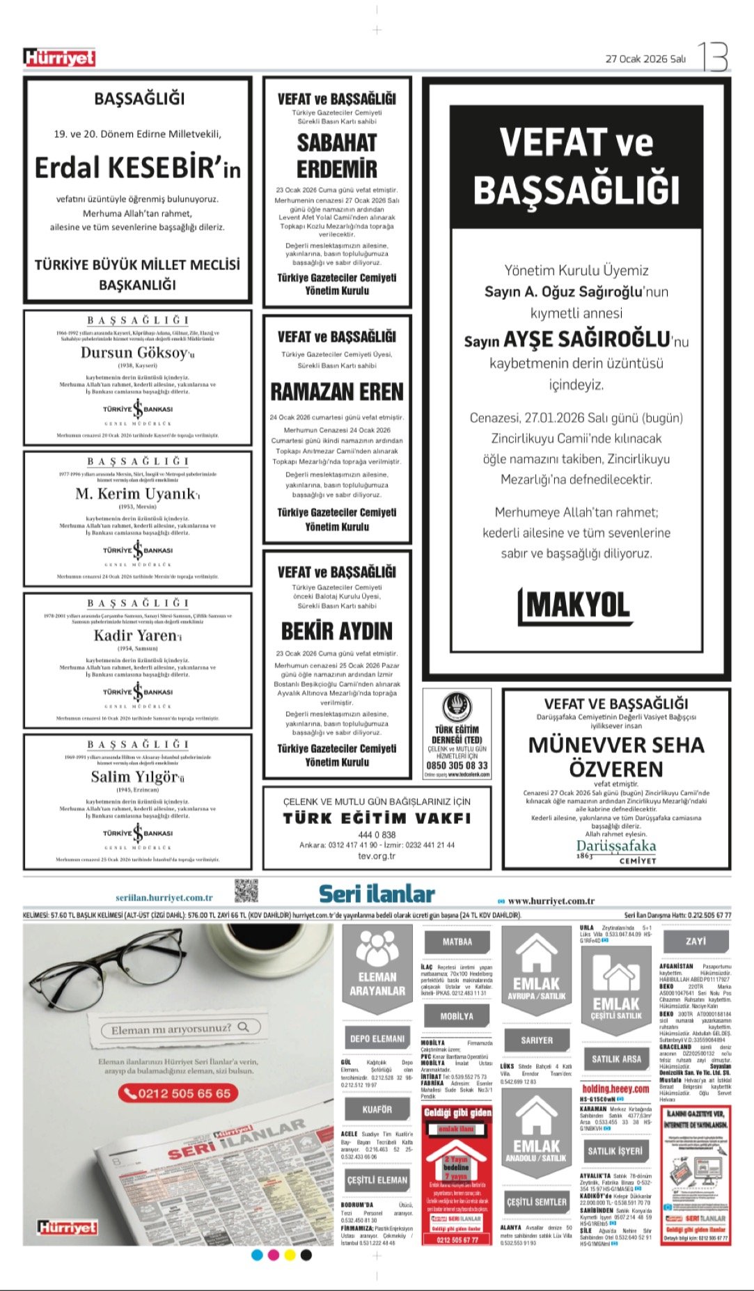 Hürriyet Bugünkü Vefat (Ölüm) – Başsağlığı – Anma – Teşekkür – Mevlit İlanları-27.1.2026