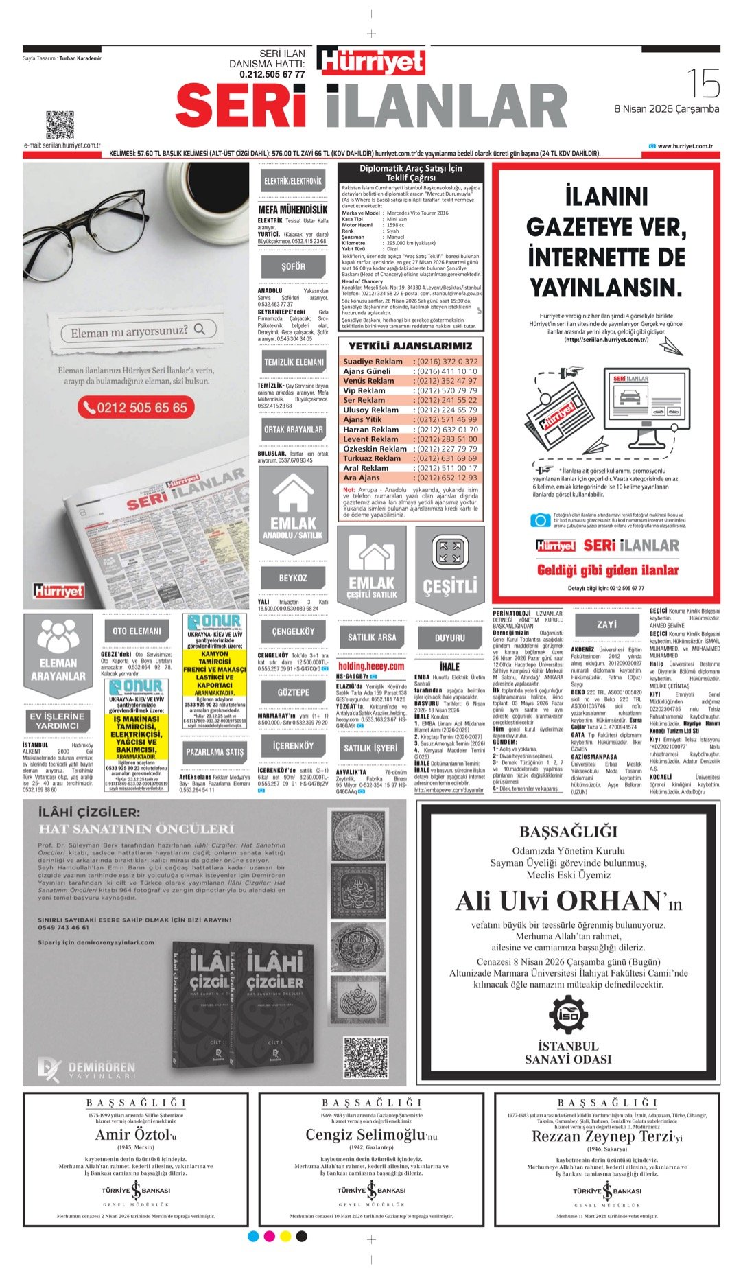 8 Nisan 2026 Hürriyet Gazetesi vefat, başsağlığı ve anma ilanları.