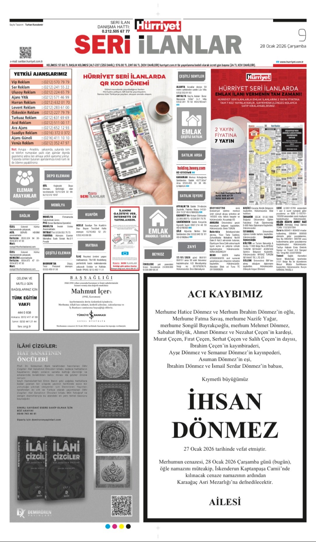 Hürriyet Bugünkü Vefat (Ölüm) – Başsağlığı – Anma – Teşekkür – Mevlit İlanları-28.1.2026
