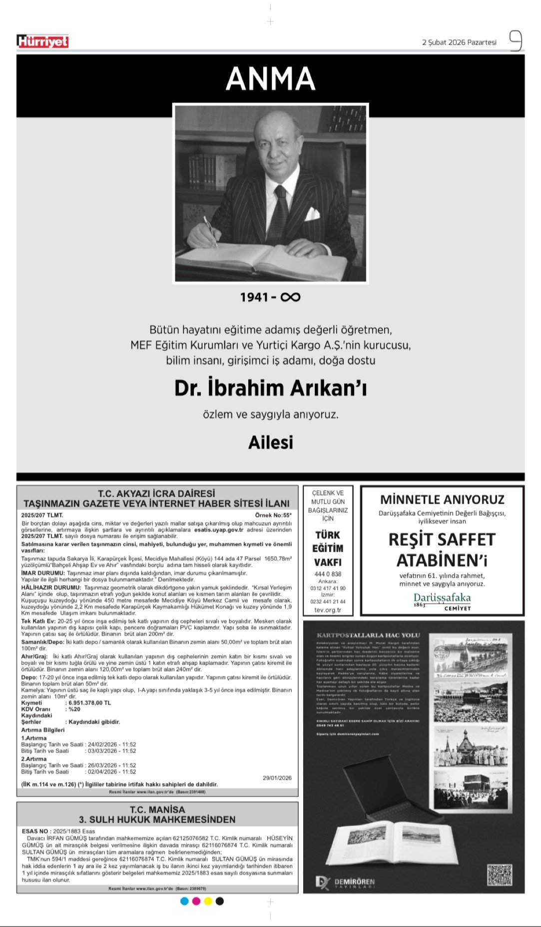 Hürriyet Bugünkü Vefat (Ölüm) – Başsağlığı – Anma – Teşekkür – Mevlit İlanları-2.2.2026